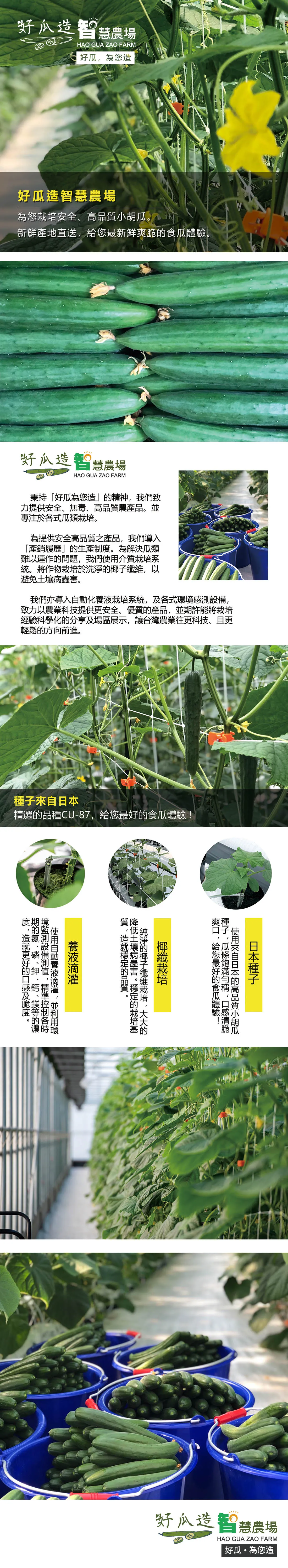 為提供安全高品質之產品,好瓜造智慧農場使用介質栽培系統,將作物栽培於洗淨的椰子纖維,以避免土壤病蟲害;並導入自動化養液栽培系統,解決極端氣候帶來的栽培障礙。
