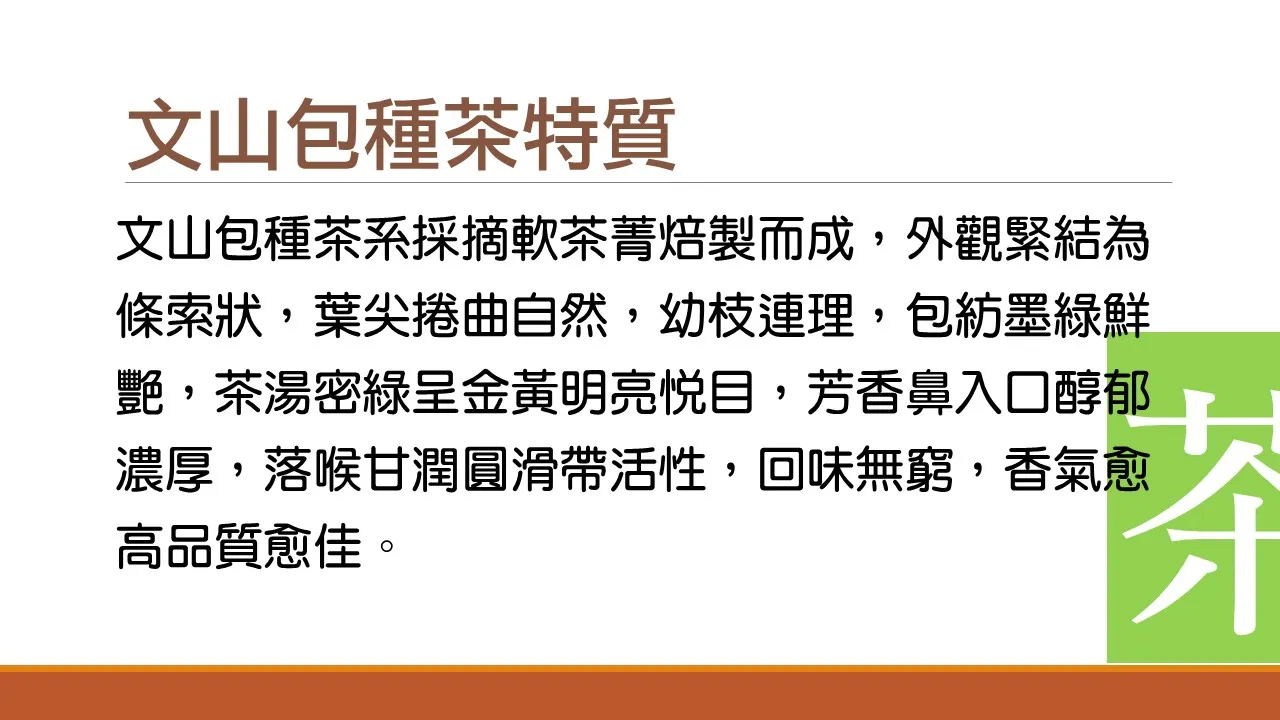包種茶產於氣候濕潤涼爽,雨量充沛,土地肥沃的台灣北部山區,其外觀呈條索狀,葉尖自人捲曲,茶葉本身色澤翠綠,茶湯呈現美麗的金黃翠綠色澤,清澈澄清,鮮豔悅目,茶香氛氛撲鼻,清新優雅,輕啐一口可以感受到其獨有喉韻回甘,餘韻無窮,具有香.農.醇.韻.美五大特色。