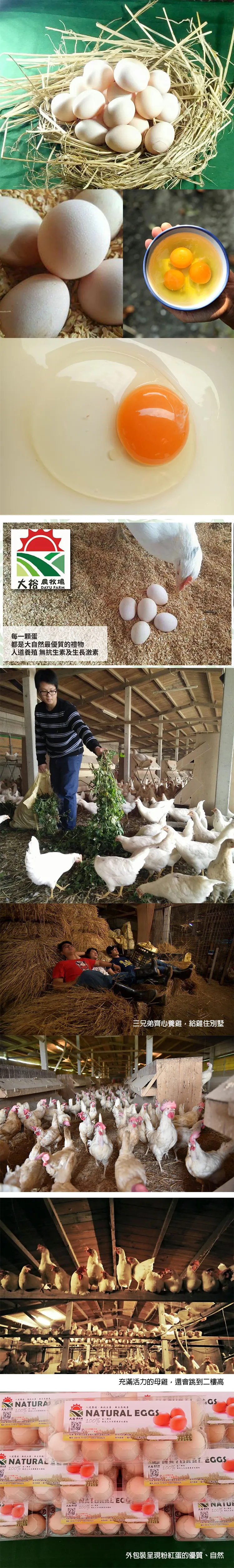 「如果雞蛋沒有腥味該有多好?」因母親的一句話,王家三兄弟全心投入創立大裕農牧場,雖然每個人已各有職業及專長,但三人一同投入飼養蛋雞,引進1800隻法國品種「伊莎」蛋雞。更令人驚奇的是這法國品種「伊莎」蛋雞所產出的蛋絕非市面上常見的白殼蛋或紅殼蛋,此品種所產出的蛋為令人討喜的「粉色蛋」。