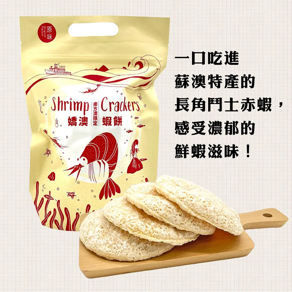 採用南方澳特產-長角鬥士赤蝦所製成,滿滿蝦味,在外面買不到!喜愛蝦餅的你絕不能錯過!