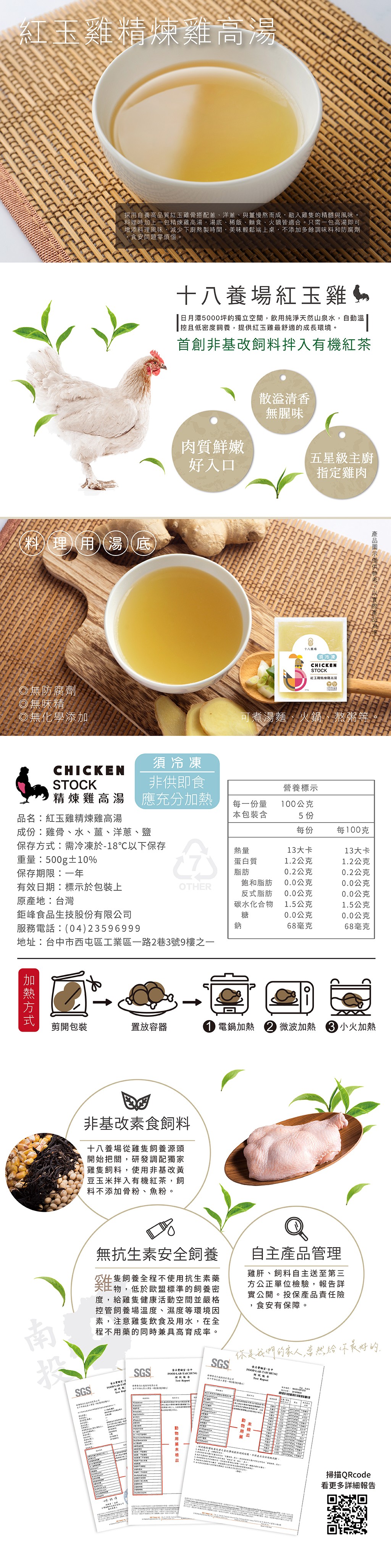採用自養高品質紅玉雞背骨搭配蔥、洋蔥、與薑慢熬而成,融入雞隻的精髓與風味。料理時加上一包精煉雞高湯,湯底、稀飯、麵食、火鍋皆適合。只需一包高湯即可增添料理風味,減少下廚熬製時間,美味輕鬆端上桌,不添加多於調味料和防腐劑,食安問題零煩惱。