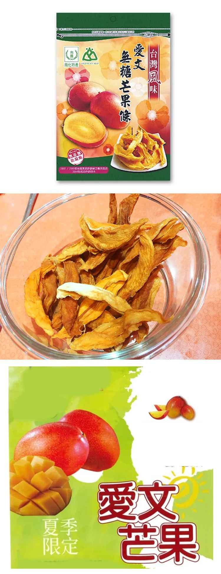 採用台南市南化果樹產銷班第24班生產果乾產品, 外銷果園生產愛文芒果、採收送驗通過才加工果乾。也許芒果給人就是很甜膩的印象無需再加糖。但我們成份中的糖是「製作過程」。延續古法將芒果熱水川燙後,浸泡於冰涼的「糖水」中;讓芒果形成一層糖衣。烘烤時隨著溫度升高,糖慢慢預熱融化脫落。這樣烘烤出的芒果乾,特別Q軟不硬口,更能完整留住芒果的香味。