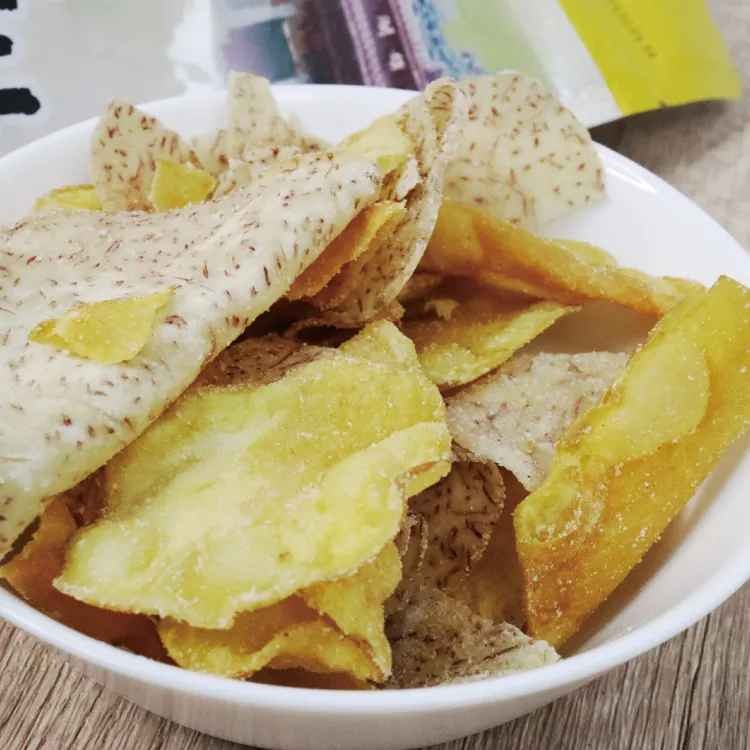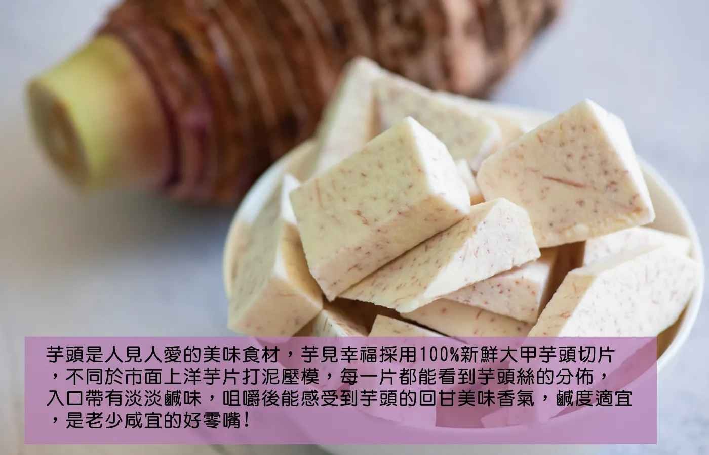 採用100%新鮮大甲芋頭切片,不同於市面上洋芋片打泥壓模,每一片都能看到芋頭絲的分佈,入口帶有淡淡鹹味,咀嚼後能感受到芋頭的回甘美味香氣,鹹度適宜,是老少咸宜的好零嘴!