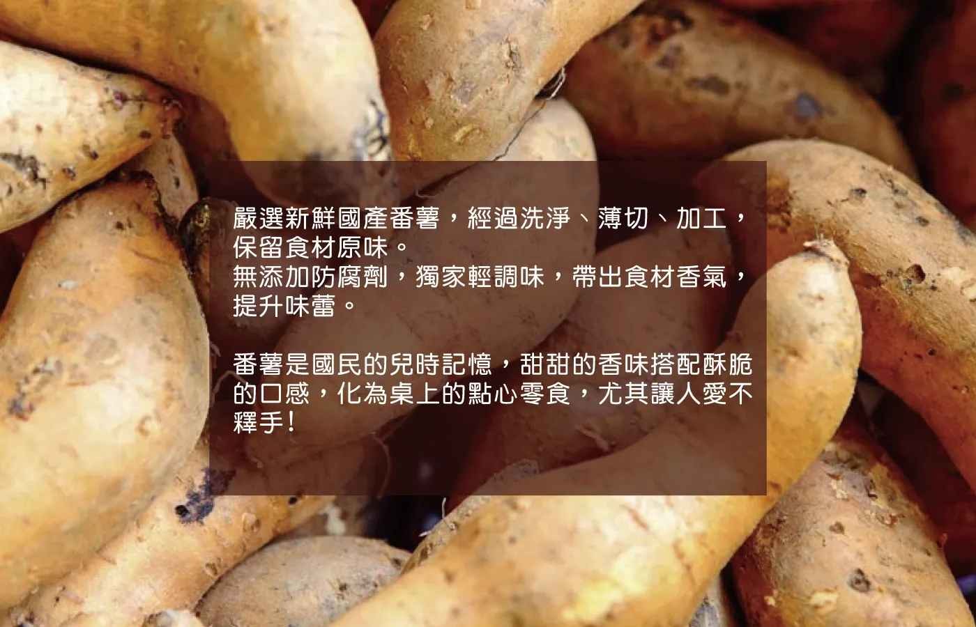 使用大甲在地種植地瓜,透過專業加工技術,鎖住番薯的甜美原味,再搭配些許砂糖與鹽的完美比例調和,甜甜的香味搭配酥脆的口感,化為桌上的點心零食,尤其讓人愛不釋手!