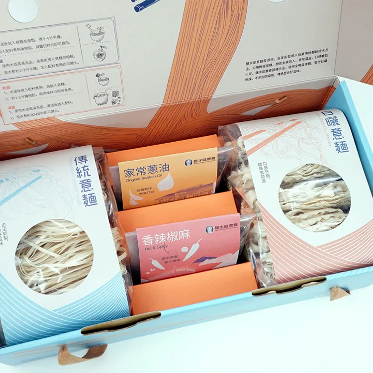 由鹽水區農會獨家開發的鹽水好麵成雙-雙醬禮盒,其傳統手工意麵製作為使用台灣生產、台灣製造小麥麵粉、產銷履歷玉米粉及全鴨蛋入麵,並堅持傳統做法以日曬增加麵體飽滿度及Q度,不添加防腐劑,吃麵體吃起來彈牙且口感滑順,搭精挑細選蔥香超濃郁的「油蔥」醬料包與椒麻香十足的「椒麻口味」醬料包,搭配寬麵與細麵,不論是煮湯麵或乾麵都很讚喔,而且5分鐘即能快速上桌,適合下班後想立馬食用或是夜宵快速完食的最佳選擇。