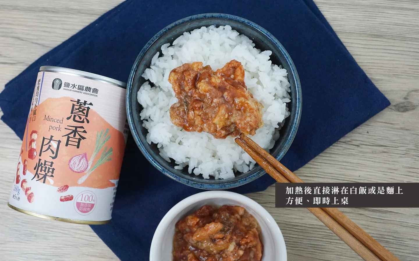 鹽水蔥香肉燥由鹽水區農會與欣欣生技食品有限公司合作,嚴選每頭豬只有的兩塊松阪肉,以獨家古傳配方精心熬煮數小時,製成黃金比例的古早味香蔥肉燥罐頭,加熱後直接淋在白飯或是麵上,口感滑嫩、入口即化,是很方便的即時上桌料理。
