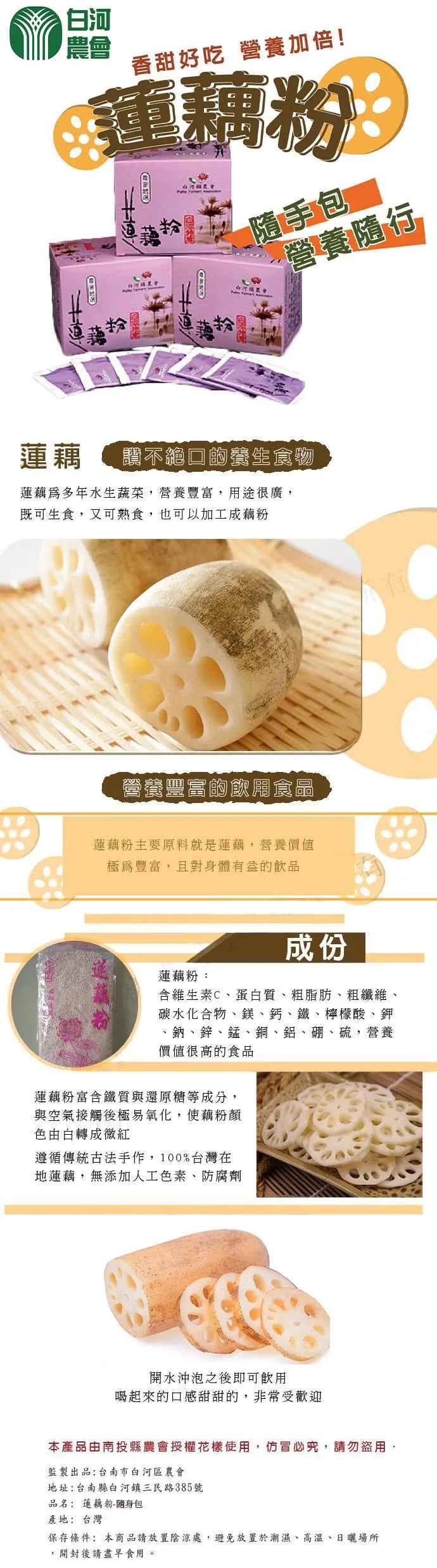 白河鎮農會出品,保證純連藕粉製造,不含太白粉、人工色素、防腐劑或其它成份…