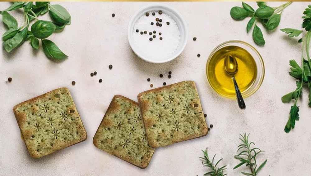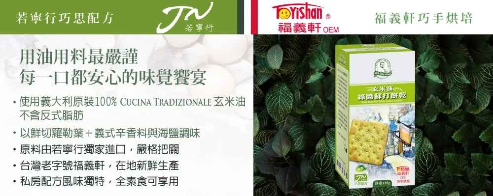 若寧行獨家配方與台灣著名《福義軒餅家》巧手烘焙新鮮特調的羅勒綠醬(九層塔)與玄米油交融的醇厚底蘊,佐海鹽之鮮,香氣怡人宛如置身義大利田園香草間,是適合全家人的超人氣健康餅乾!
