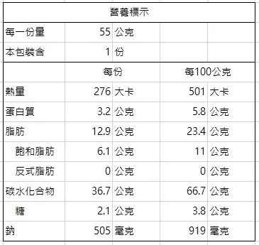 其他揭露事項 : 本產品含麩質之穀物、大豆、牛奶/羊奶及其製品,且生產設備同時使用於製造含有蛋、花生、甲殼類、魚類、芝麻、堅果類產品,不適合其過敏體質者食用。