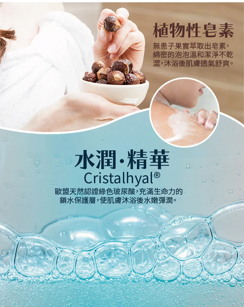 來自大自然的無患子皂素,添加法國認證機構的Cristalhyal 綠色玻尿酸,含有豐富的細緻泡沫,,果皮也富含胺基酸等多種成分,溫和洗淨。