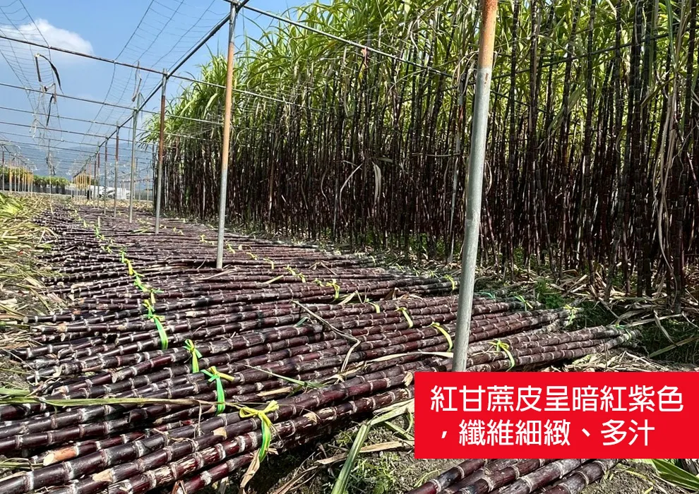 紅甘蔗皮呈暗紅紫色,纖維細緻、多汁,香氣濃郁,適合直接咀嚼或榨汁,能完整保留其天然香甜與風味。