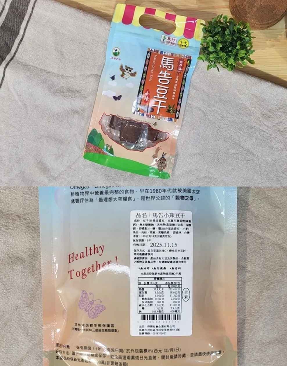 馬告豆乾是選用非基改的黃豆為基礎,加上部落的馬告胡椒調味,胡椒雖帶一點辣味,但是不敢吃辣的朋友也會喜歡。