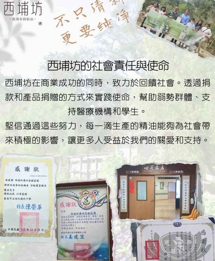 西埔坊茶樹精油 是位在台南市南化區西埔里的樂活小農,種植的是澳洲茶樹,從種植到提煉,甚至銷售全部過程都由主人一手包辦,讓大家使用起來安心!
