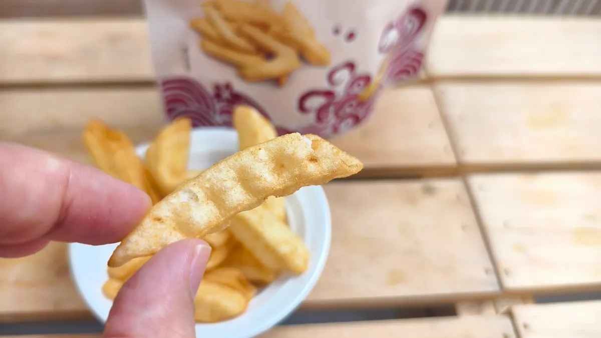 <成 份>: 馬鈴薯澱粉、馬鈴薯薄片、鯛魚、米穀粉、棕櫚油、砂糖、食鹽、烤蒜外灑粉(L-麩酸鈉、蒜粉、匈牙利紅椒粉、胺基乙酸)、粉末辣椒精(麥芽糊精、乳糖、油性辣椒精、二氧化矽)、碳酸氫鈉(膨脹劑)、大蒜、蝦肉、甜菊糖苷(甜味劑)、食用色素黃色4號(著色劑)、食用色素黃色5號(著色劑)