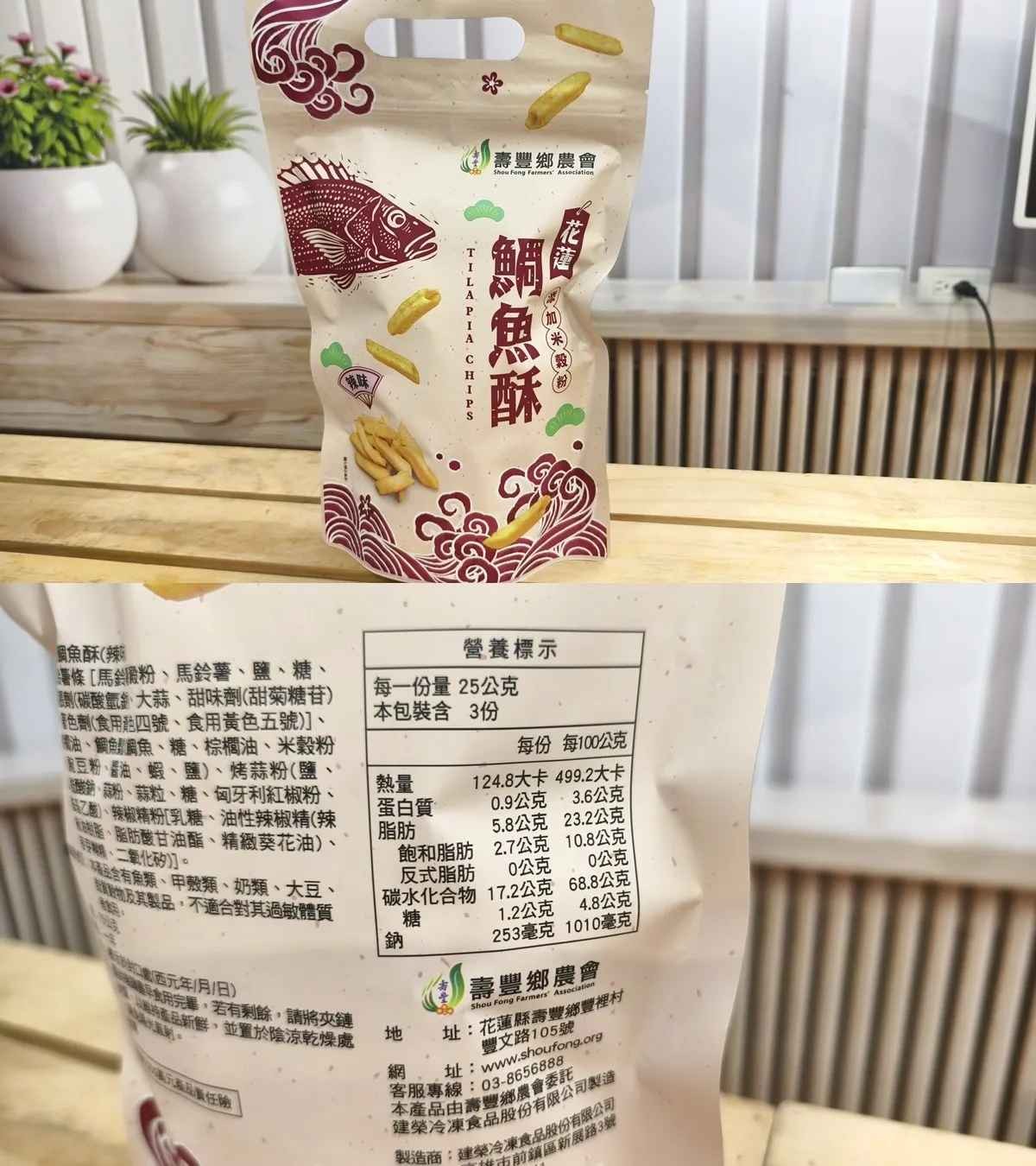 鯛魚酥條原料來自壽豐在地養殖台灣鯛, 特添加米穀粉、餅體採中空增加酥脆口感。一次滿足您口腔味蕾~ 是您休閒時最佳零嘴!