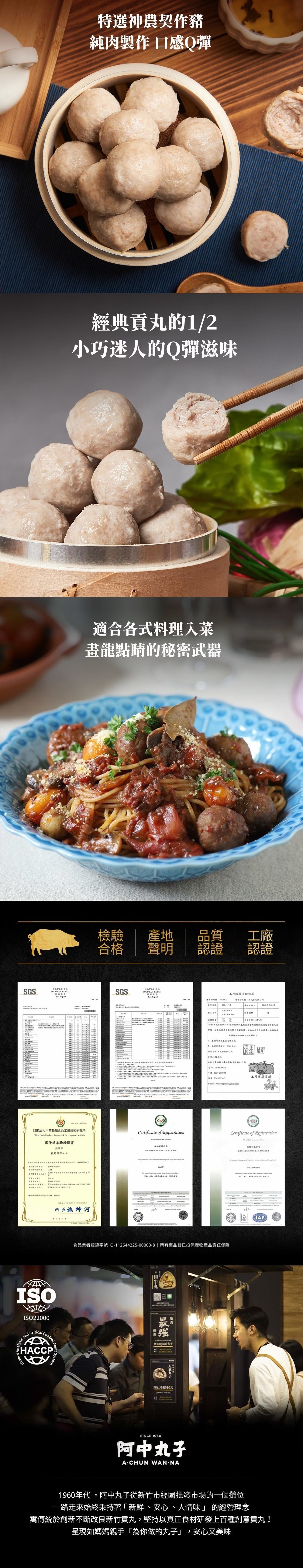 嚴選神農得獎牧場所契作的台灣豬,以傳承60年專業貢丸匠技研製成99.9%純豬肉丸,肉質Q彈多汁,口感豐腴鮮醇小貢丸尺寸是經典貢丸的一半,小尺寸適合各式料理。