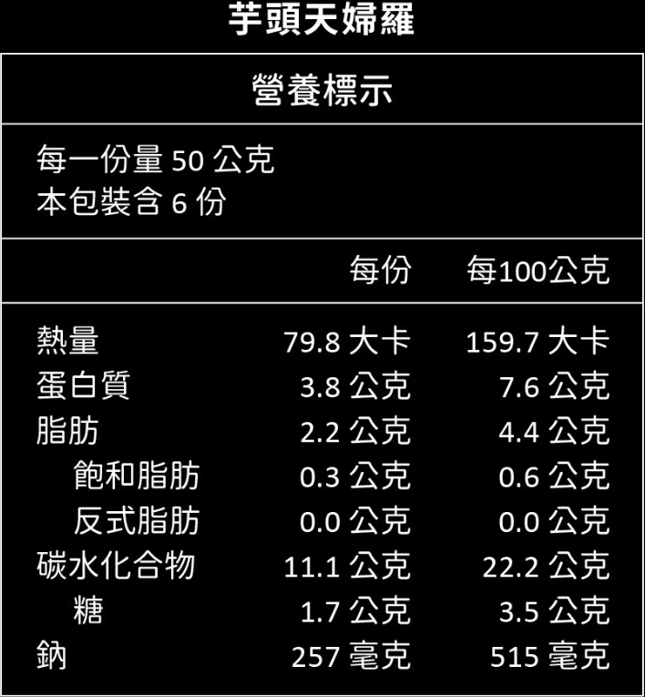 成分:魚漿、芋頭、水、馬鈴薯澱粉、樹薯澱粉、砂糖、味噌、大豆油、岩鹽、木糖、白胡椒粉、朝天椒粒。