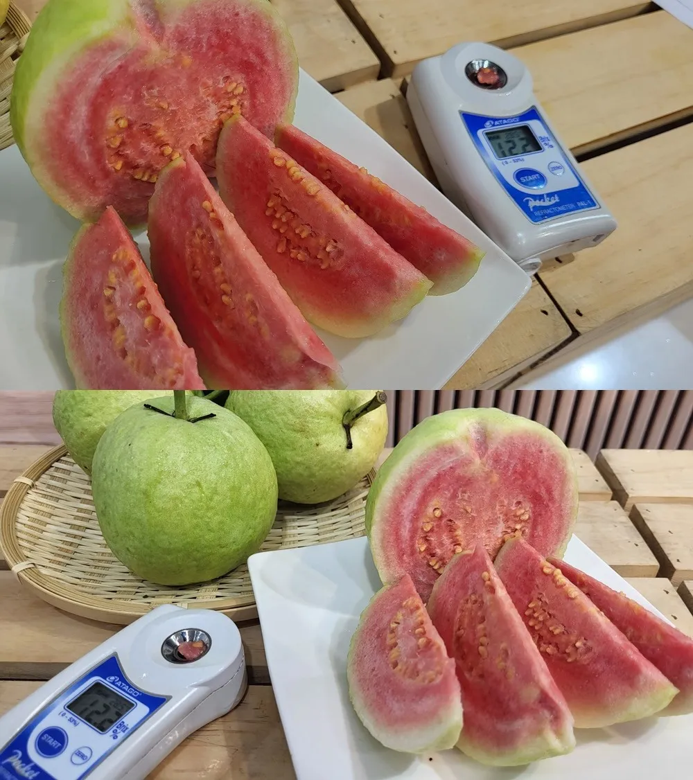 紅肉芭樂大多是土芭樂或珍珠芭樂嫁接改良的品種,其維生素及纖維含量都更豐富,紅心芭樂裡更含有茄紅素、 胡蘿蔔素,口感紮實清脆爽口,吃得安心又健康。