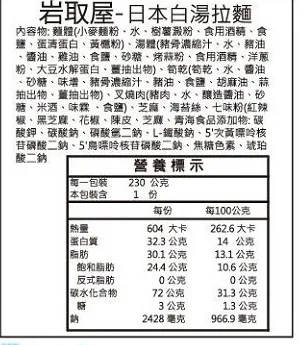 內容物:麵體、湯體、食鹽、筍乾、叉燒肉、芝麻、海苔絲、七味粉