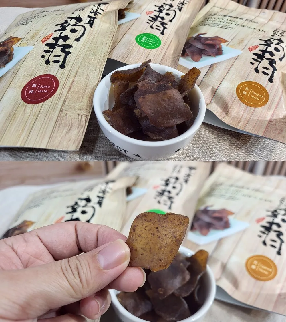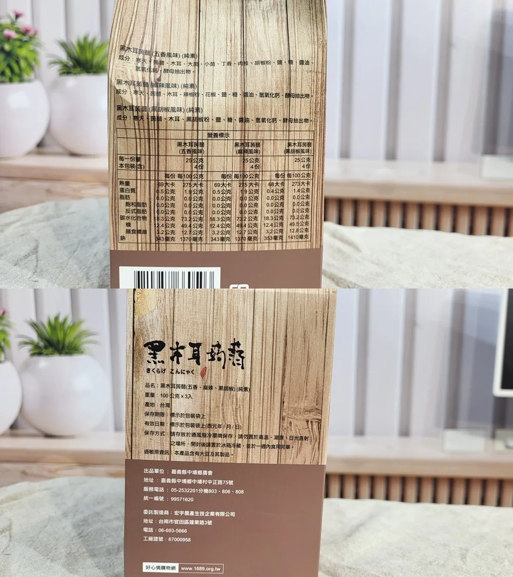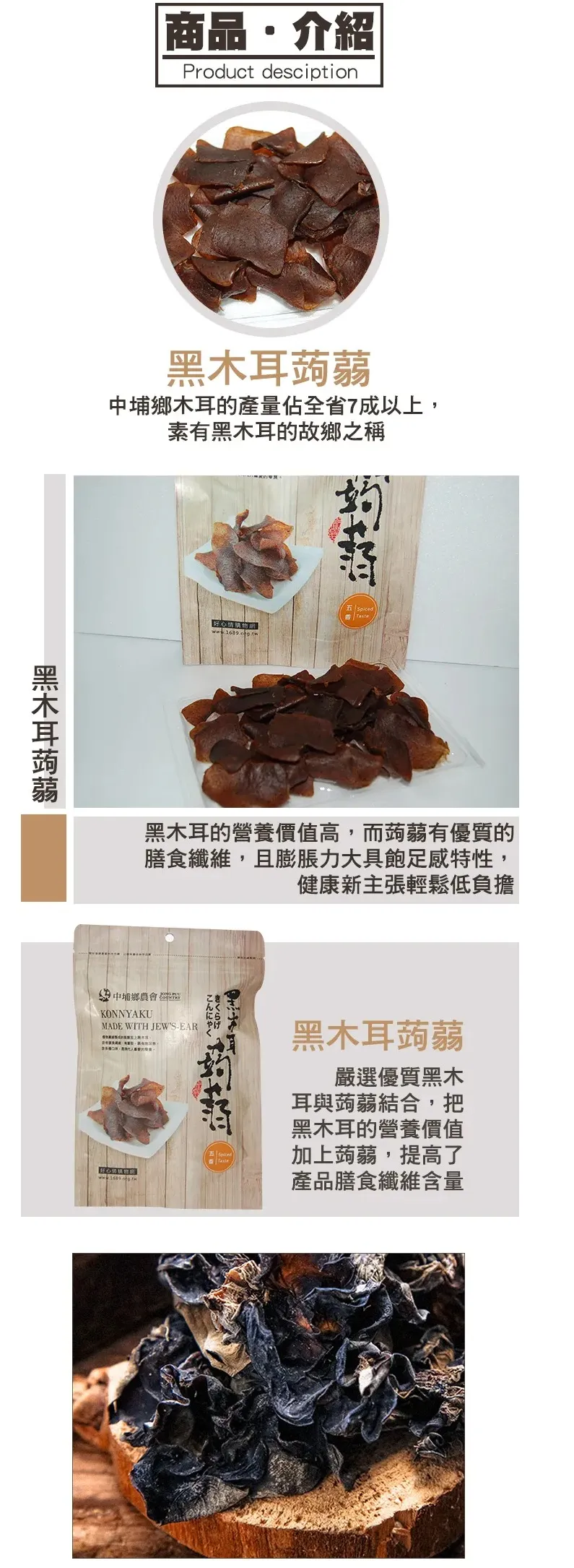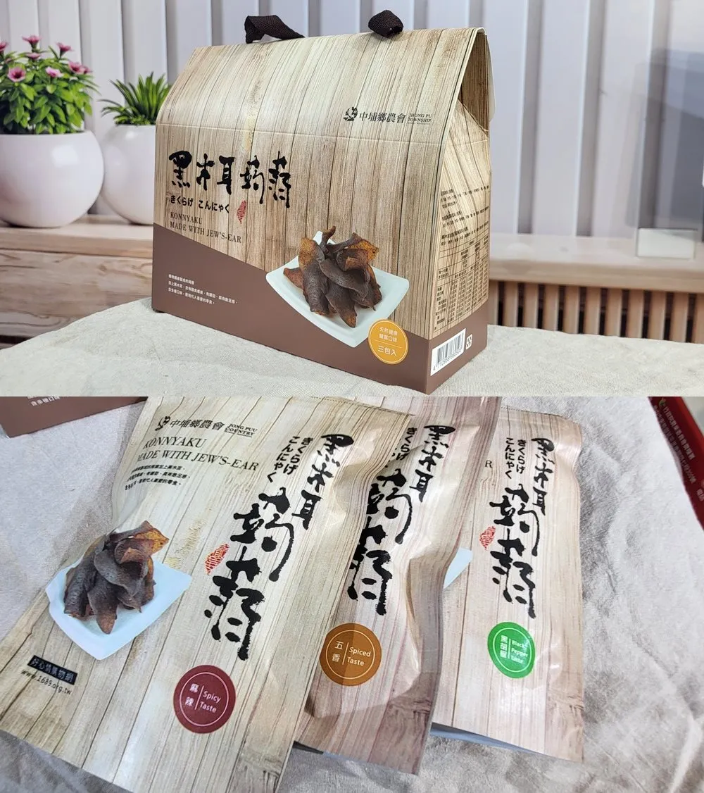 天然的蒟蒻加上中埔鄉的特產黑木耳,做成含豐富膳食纖維、天然有嚼勁、具有飽足感