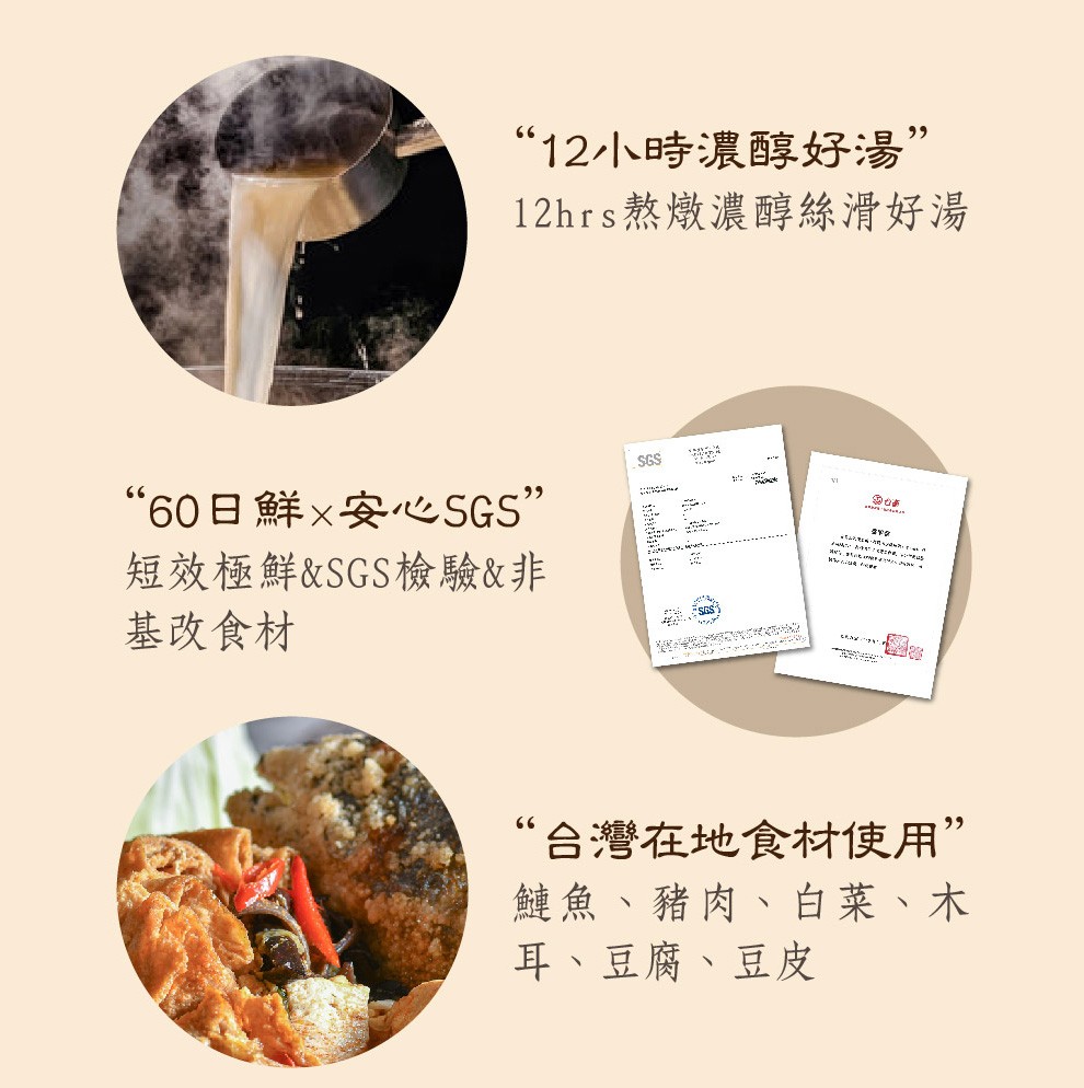 成份:豚骨高湯(水、豚骨(台灣))、大白菜、豆腐(非基改黃豆、水、碳酸鈣、氯化鎂)、沙茶醬(黃豆油、糙米皮、扁魚、紅蔥頭、糖、食鹽、辣椒粉、薑黃粉、辣椒紅、烏胡椒、花椒、桂通、大茴、L-麩酸鈉、琥珀酸二鈉、5'-次黃嘌呤核苷磷酸二鈉、5'–鳥嘌呤核苷磷酸二鈉) 豆皮(非基改黃豆、大豆沙拉油、脂肪酸甘油脂、碳酸鈣、大豆卵磷脂、矽樹脂)、豬肉片(台灣)、黑木耳、蔥、蒜、辣椒、蝦米、洋蔥、糖、食鹽
