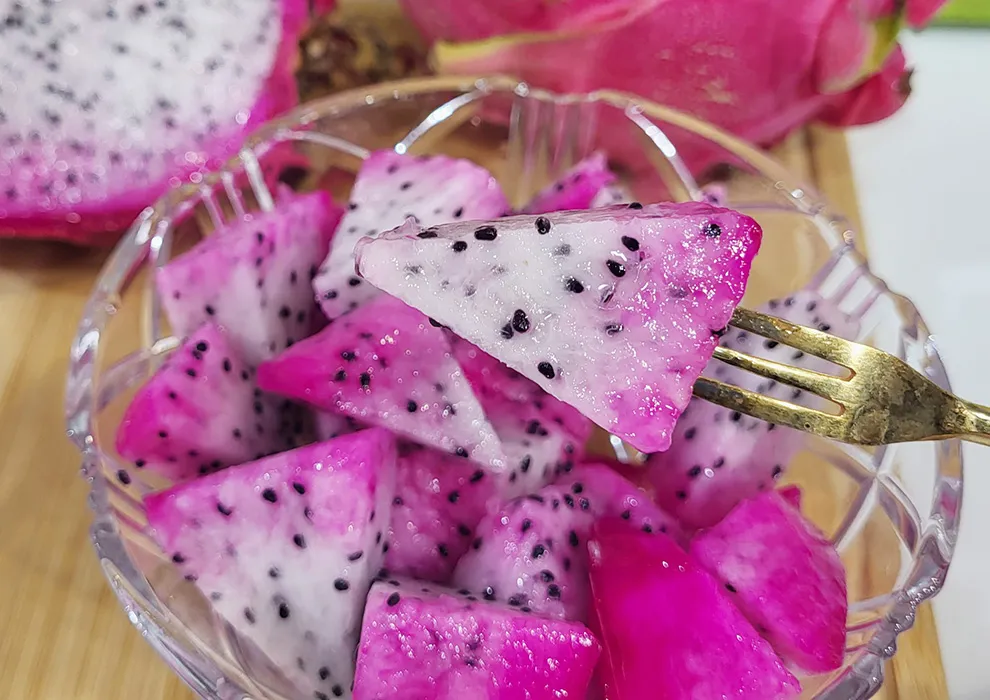 6月至12月間是火龍果盛產時期,火龍果營養成份包含礦物質、維生素、膳食纖維及果膠類物質,但白肉與紅肉火龍果因顏色、口感不同,而「雙色火龍果」可一次享受兩種優點。