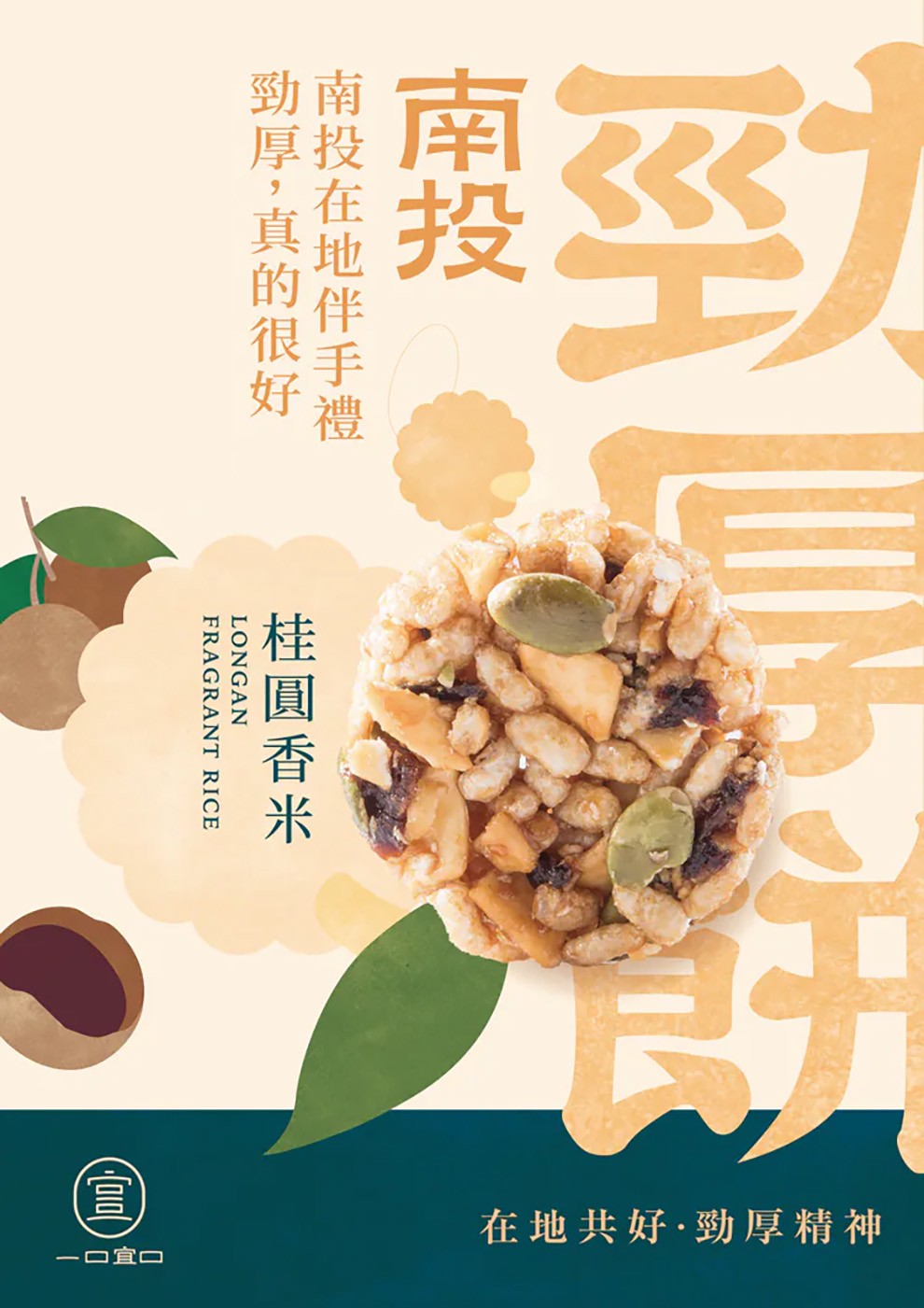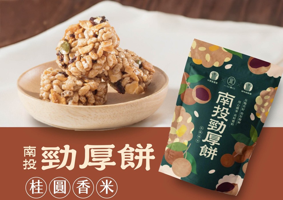 一口宜口秉持「在地共好」精神,以草屯鎮農會提供的「台灣越光香米」為基底,嚴選當地特色農產,推出南投勁厚餅。