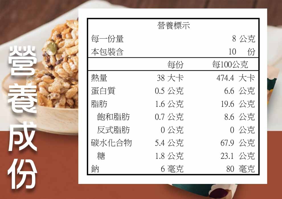 成份:麵粉 、雞蛋、米、南瓜子 桂圓乾、棕櫚油、黑糖、麥芽糖、食鹽、碳酸氫餃(膨脹劑)