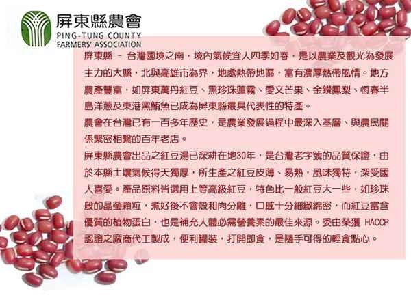 屏東縣-萬丹鄉位居屏東縣西南位置,西界高屏溪(原下淡水溪)毗鄰高雄縣,地勢平坦,地下水源豐,非常適合紅豆生長環境,所生產紅豆品質優良,適合做成點心蜜汁紅豆,不用煮沸,加冰塊或牛奶即可食用,添加豆花、粉圓、刨冰、湯圓立即好吃。