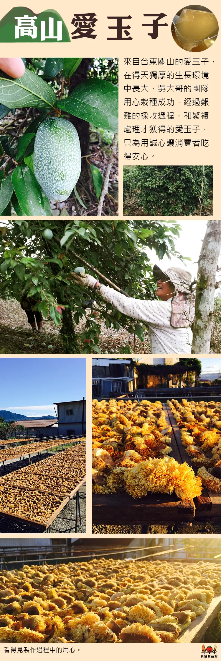 愛玉子唯台灣特有之作物,栽種需經7~8年之久,生長環境需大自然的濕氣及土壤之養份才足以蘊育愛玉子收成。天然愛玉子製作過程會釋放大量膠質產生做用凝固成愛玉凍,無需添加任何人工合成物,其含有大量的植物性果膠搓洗後可拿來敷於手部,待幾分鐘後洗淨會感覺皮膚變的光澤而細嫩,所以愛玉為最天然的膠原蛋白