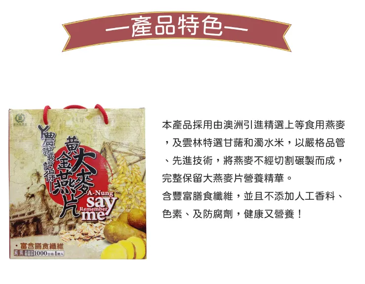 ㄚ農黃金大燕麥片是採用上等食用燕麥,以及雲林縣水林鄉優質甘藷和濁水米,以嚴格品管、先進技術,將燕麥不經切割碾製而成,完整保留大燕麥片營養精華,富含膳食性纖維、β-聚葡萄糖等天然健康營養元素,絕對不含反式脂肪。