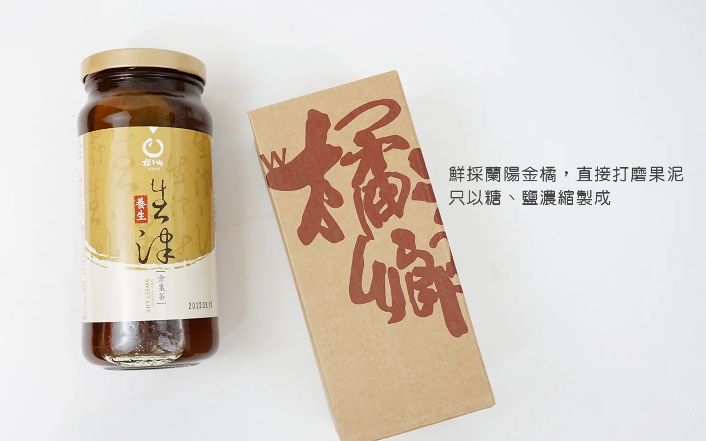 加入5倍開水即成為生津止渴的金棗茶,是老師、教授及辦公室上班族們的最佳夥伴。鮮採蘭陽金橘,直接打磨果泥,只以糖、鹽濃縮製成,完全不添加防腐劑、色素、香料等化學藥劑