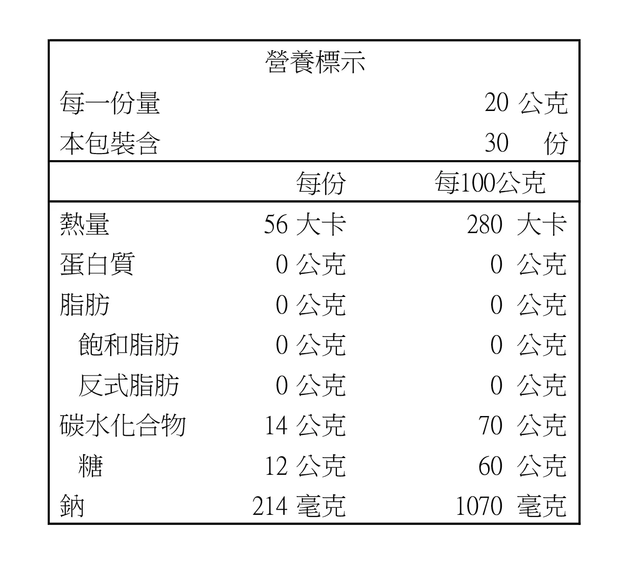 營養成分(每一份量20公克):