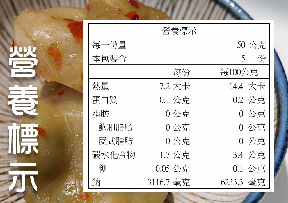 成份:結球芥菜、鹽、辣椒、醋磺內酯鈉(甜味劑)、L-麩酸鈉(味精)、食用色素黃4號、苯甲酸(防腐劑)0.6 g/kg 以下、偏亞硫酸氫鈉 0.03 g/kg 以下