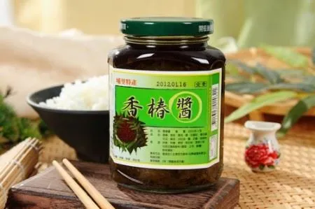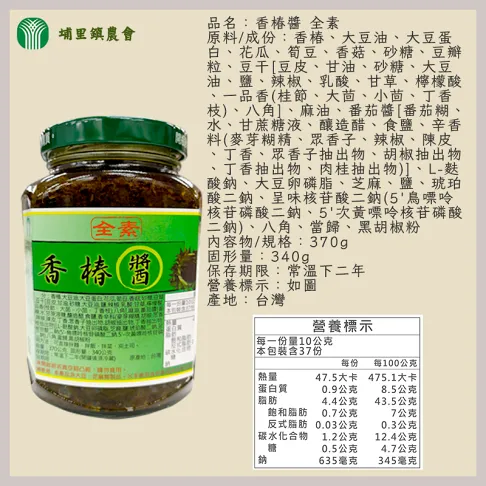 【內容物成份】香椿、大豆油、大豆蛋白、花瓜、筍豆、香菇、豆瓣粒、豆干豆干(非基因改造)[豆皮、甘油、砂糖、大豆油、鹽、辣椒、乳酸、甘草、檸檬酸、一品香(桂節、大茴、小茴、丁香枝)]、麻油、番茄醬、L-麩酸鈉、大豆卵磷脂、芝麻、鹽、琥珀酸二鈉、呈味核甘酸二鈉、八角、當歸、黑胡椒粉
