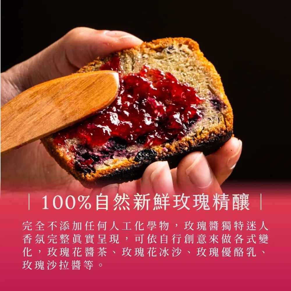 玫瑰花瓣醬用法多元,除了可做為土司、餅乾的沾醬外,也可加入紅茶,泡成香氣四溢的玫瑰花紅茶!