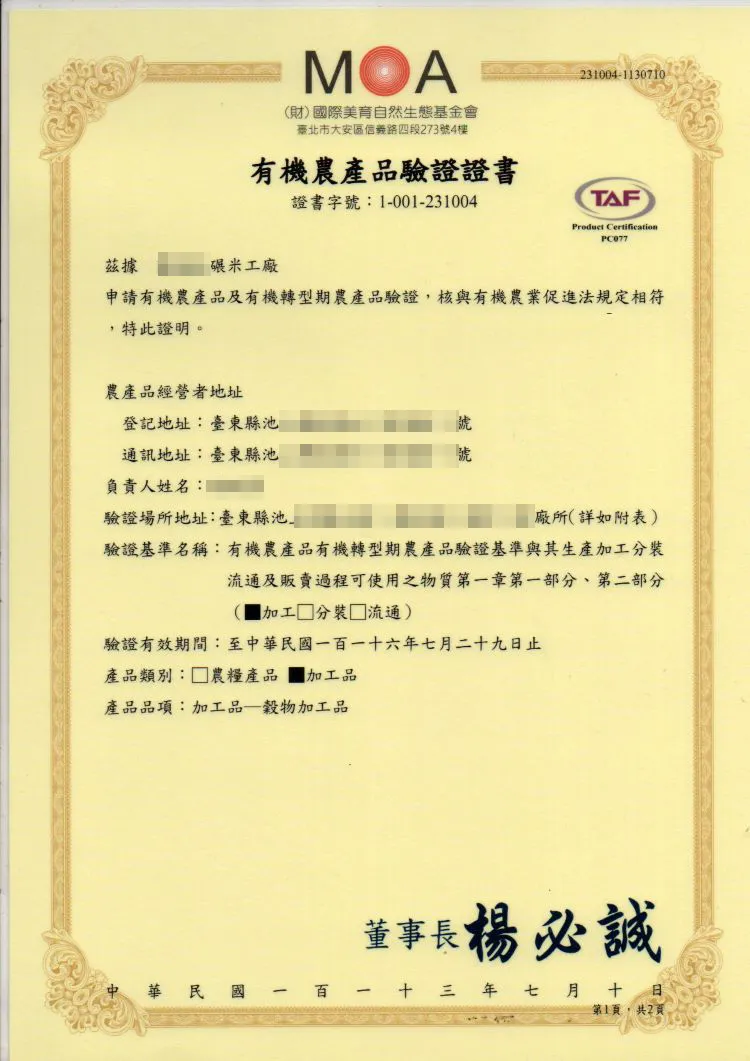 本廠專業區有機米採用『MOA』自然農法耕作,嚴禁農藥使用,是採用核可的有機 資材所種出來健康、自然的有機米。因池上地區無污染性工業工廠進駐,水質及土壤 本質先天優良且後天控制得宜,所採用的自然農法耕作的稻米,可說是最健康的有機 米、再加上經由全國第一屆米質競賽總冠軍邱垂昌先生,擔任本專業區輔導員、指導農民栽種,讓大家吃到具冠軍米水準的有機米。