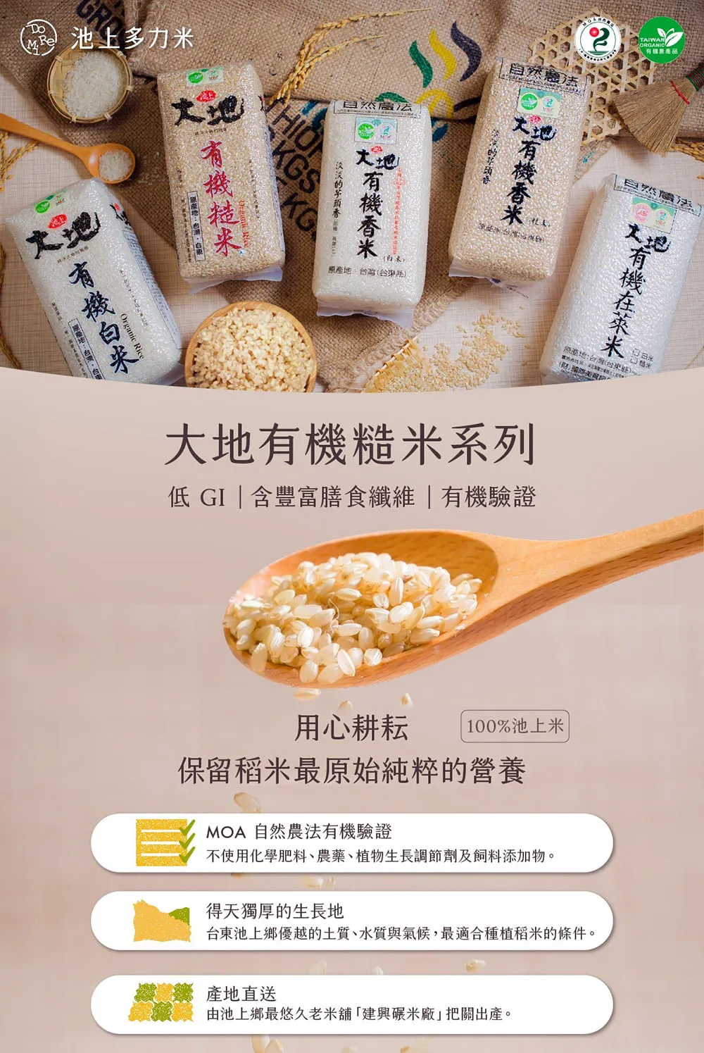 栽培有機米,由池上鄉萬安社區所推廣採"自然農法栽培"之有機良質米