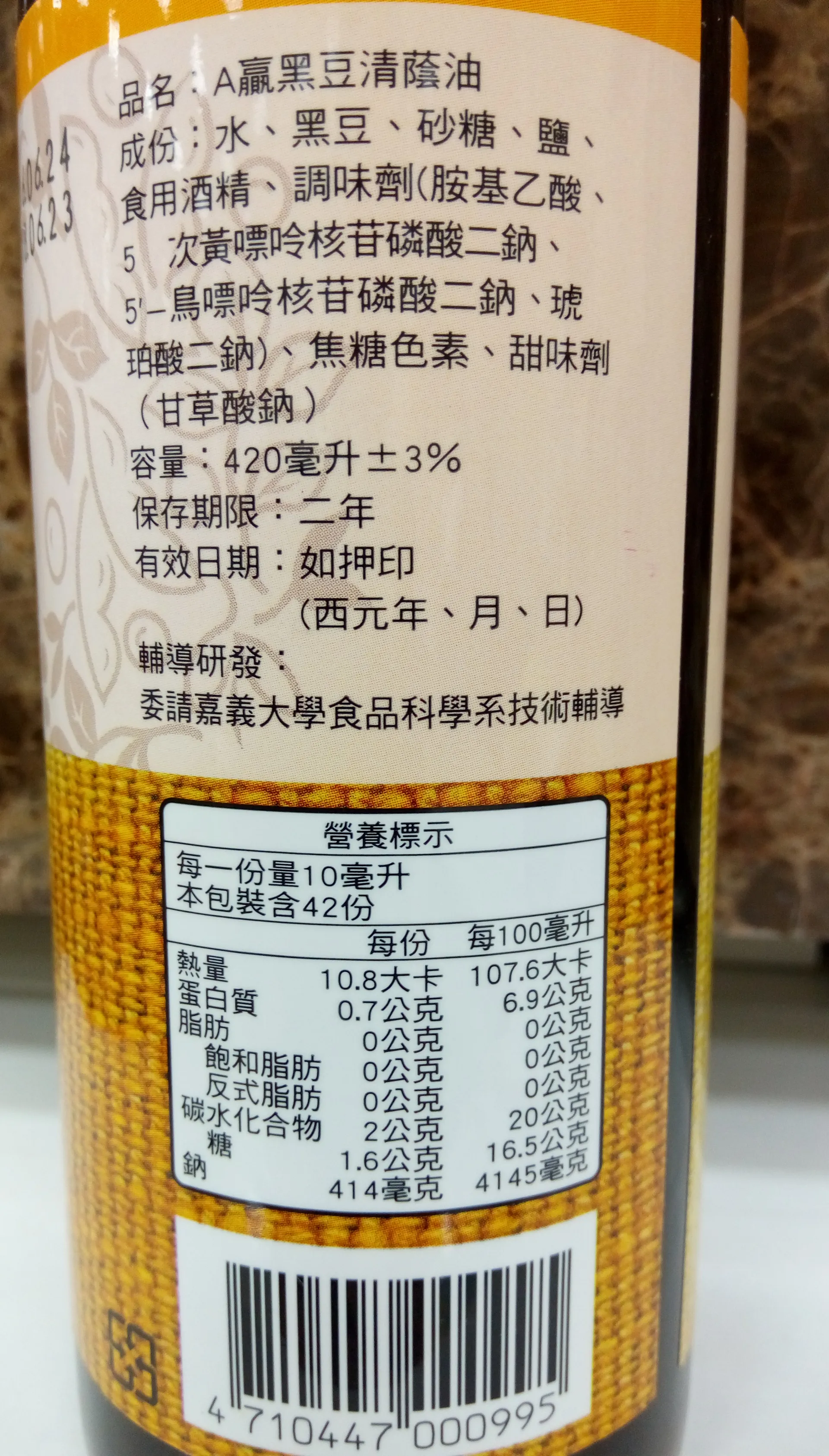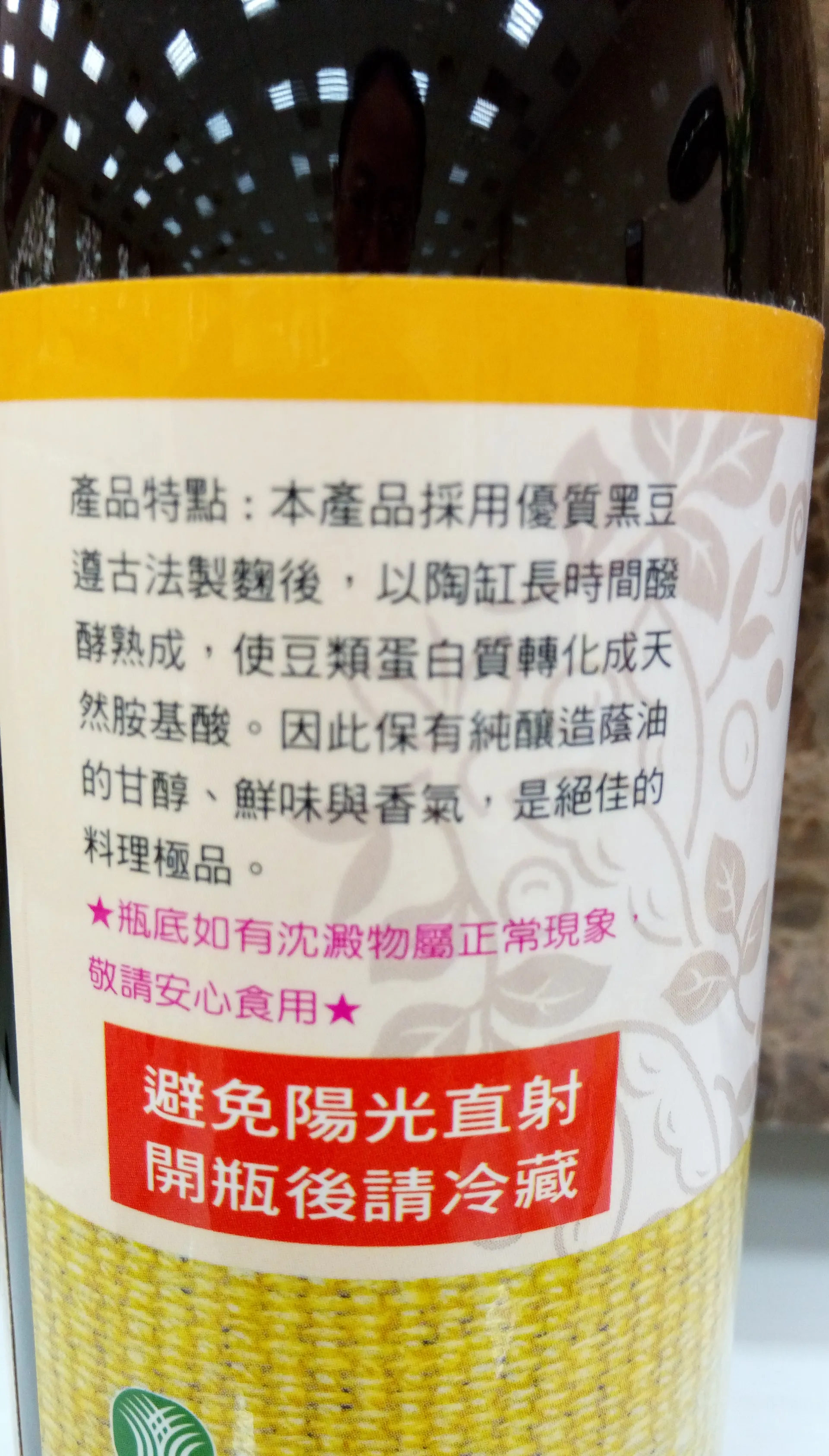 本品原料採用台南區農業改良場輔導本地農民生產之台南五號黑豆,經本會經選之優勢菌種,遵古法製麴後,以陶缸日曝發酵六個月,使豆類蛋白質分解成天然氨基酸。因此保有純釀造蔭油的甘醇、鮮味與香氣,是絕佳的料理極品。