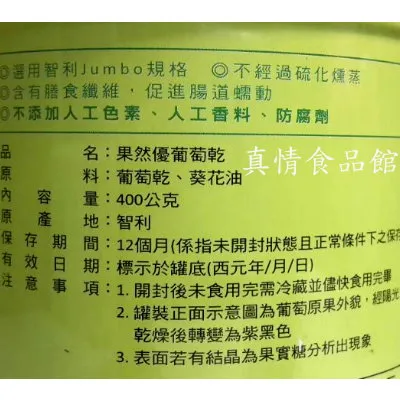 嚴選通過HACCP認證、水質純淨(來自安地斯山脈雪水灌溉)、天然日曬的超大葡萄乾,果粒超大、香Q、不甜、不膩,保留葡萄乾原始的天然風味,是您居家宴客,外出補充能量的最佳來源。