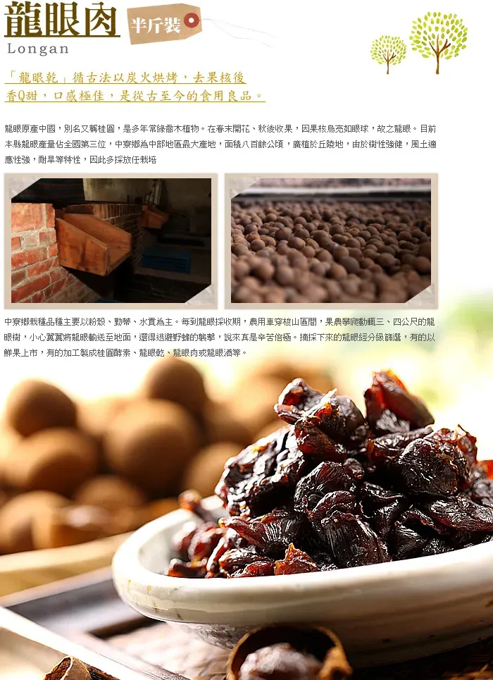 中寮農會龍眼品種以粉殼居多,水份最少,製成龍眼乾,肉質既香又Q。中寮農會堅持以龍眼木材古法炭焙,果肉金黃帶點炭焙香,Q、甜無雜味,風味獨具,無論當零嘴或入菜,是行家的最愛。龍眼原產中國,別名又稱桂圓,是多年常綠喬木植物。在春末開花、秋後收果,因果核烏亮如眼球,故之龍眼。目前本縣龍眼產量佔全國第三位,中寮鄉為中部地區最大產地,面積八百餘公頃,廣植於丘陵地,由於樹性強健,風土適應性強,耐旱等特性,因此多採放任栽培,是一天然健康、無農藥殘留之健康水果。特色:堅持以古法炭焙,過程既費時又費工,所製龍眼乾風味獨具。