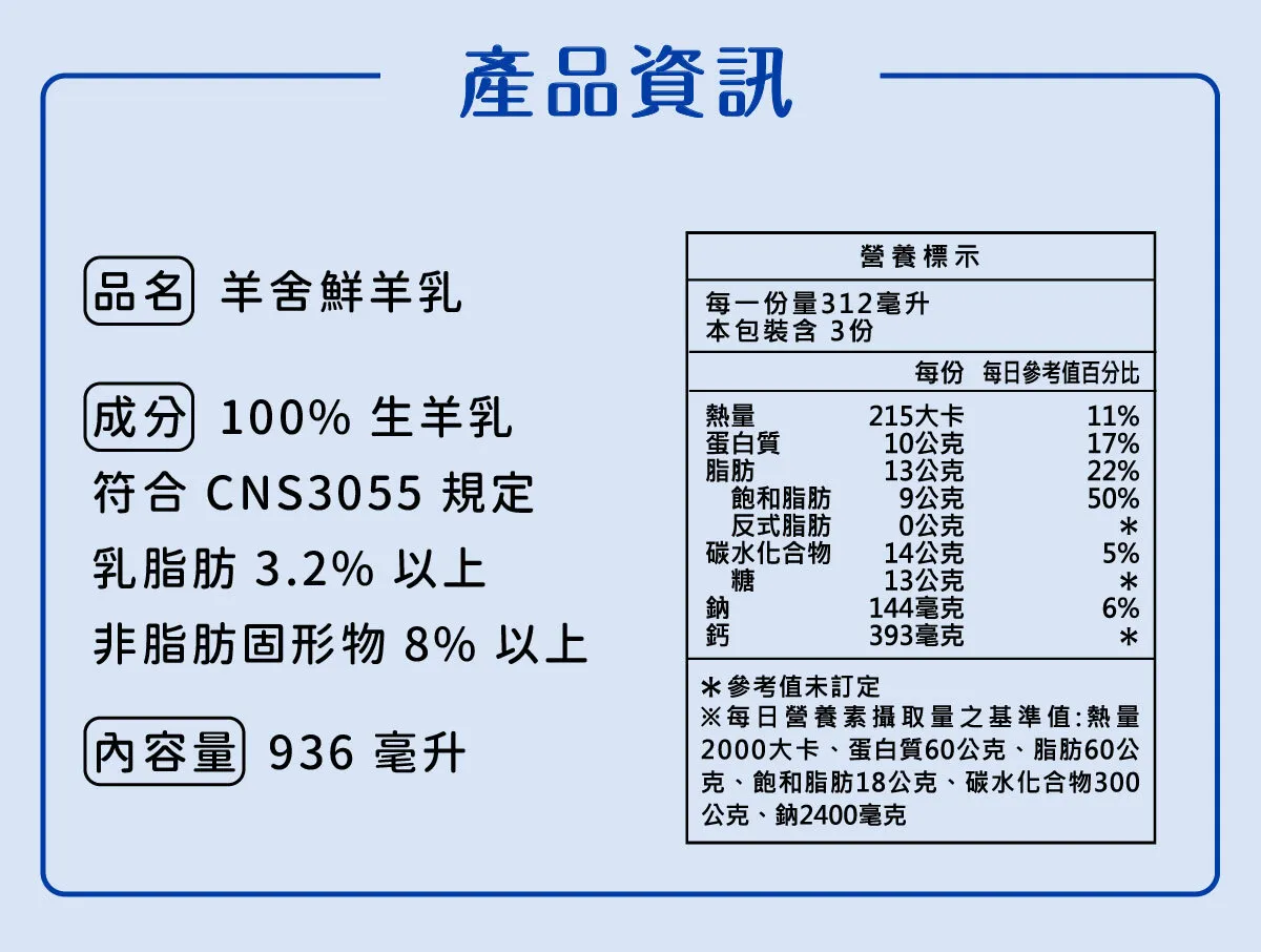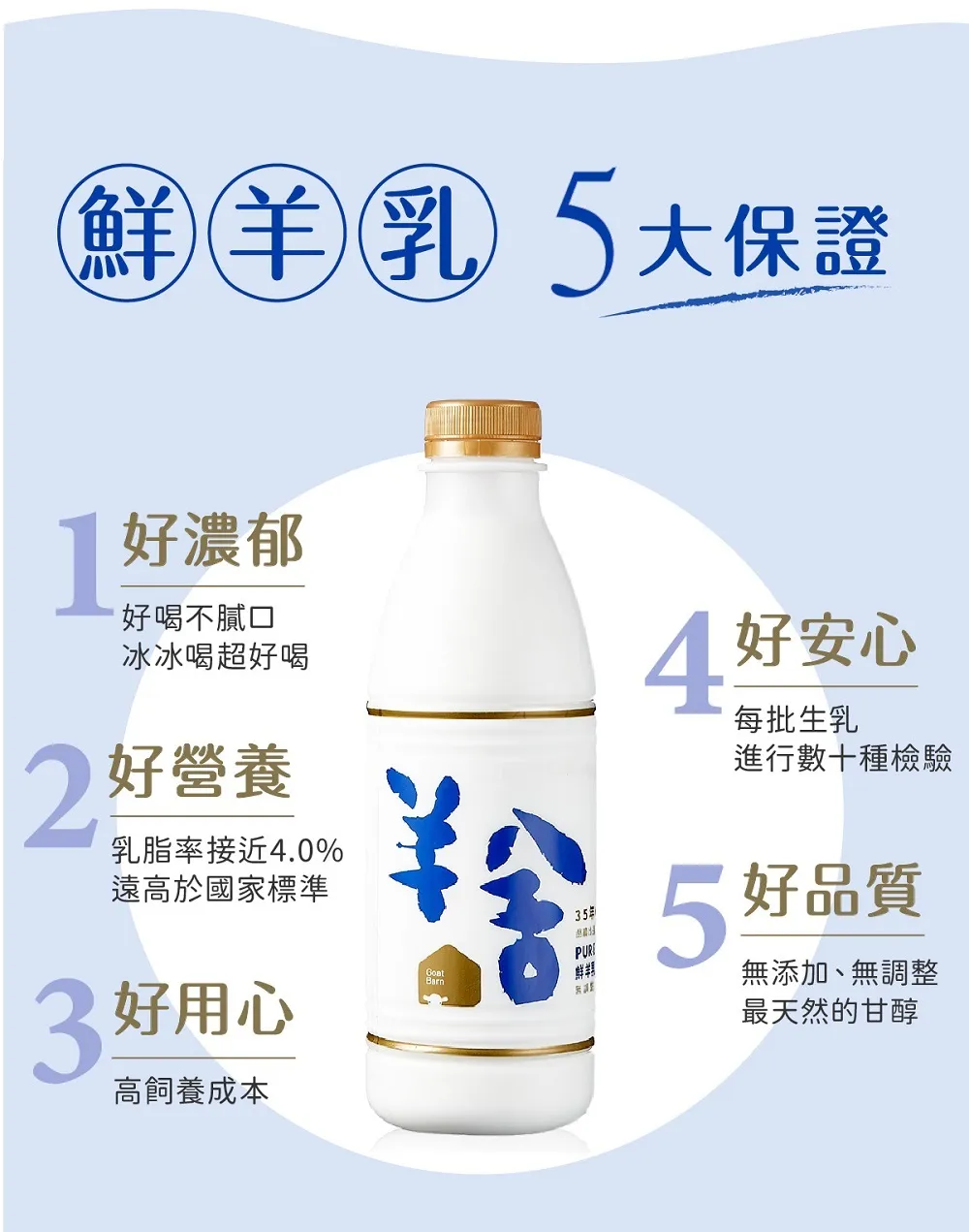 備註欄:100%生羊乳殺菌,無調整無添加。需4度以下冷藏,開封後請盡快食用完畢。請放於冰箱中層層板,勿放置於冰箱門旁,否將縮短保存期限