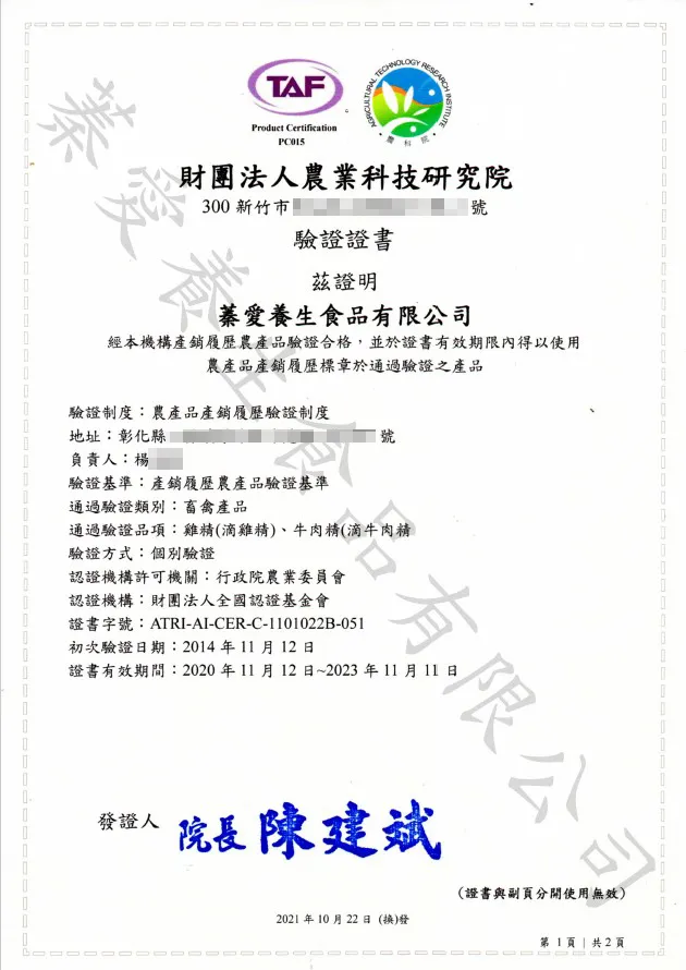 包含:飼養牧場、飼養方式(例:平飼 或 密閉負壓式水簾溫控雞舍等)、飼養禽種、上市週齡(12週齡以上的壯年雞隻),從源頭到滴精生產至包裝製程都有完整的生產紀錄,讓消費者食在好安心。