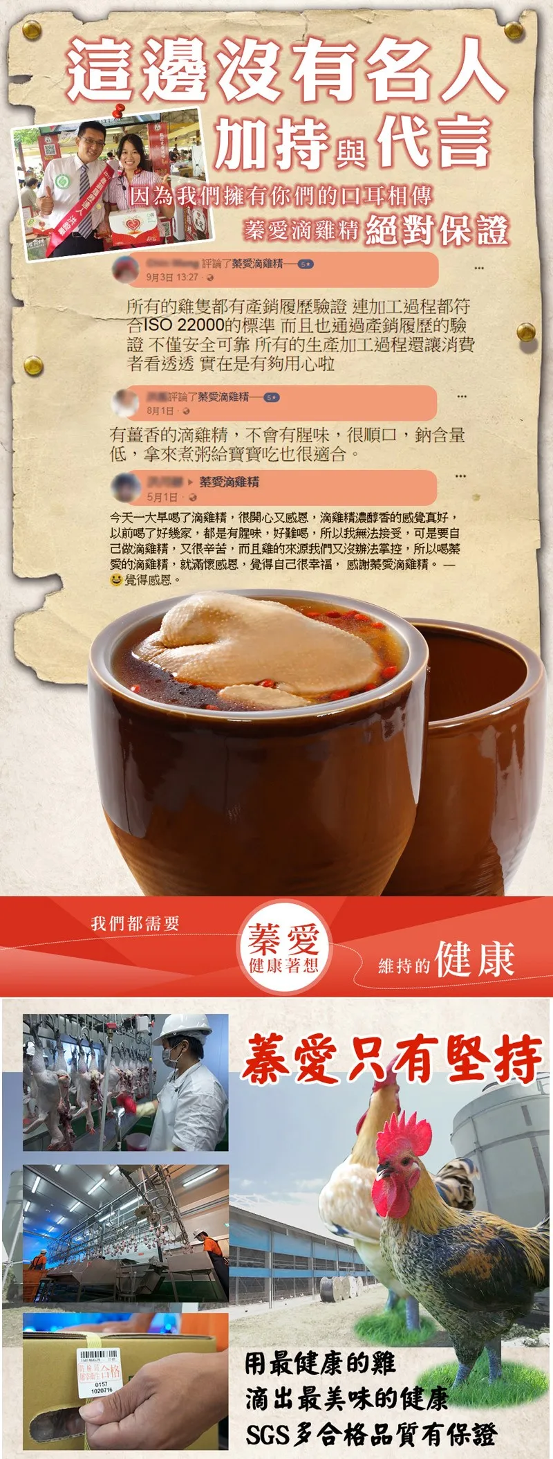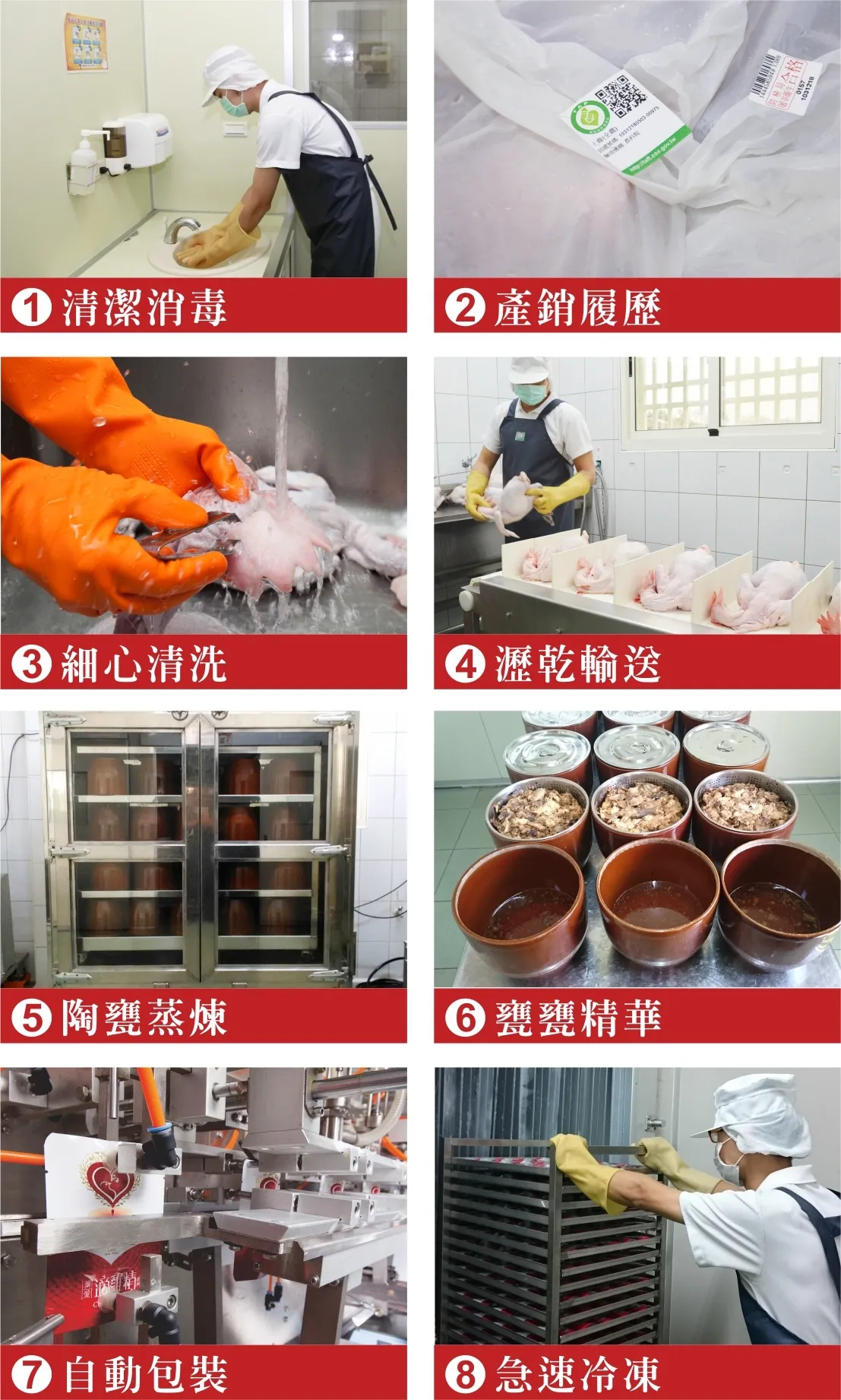 包含:飼養牧場、飼養方式(例:平飼 或 密閉負壓式水簾溫控雞舍等)、飼養禽種、上市週齡(12週齡以上的壯年雞隻),從源頭到滴精生產至包裝製程都有完整的生產紀錄,讓消費者食在好安心。