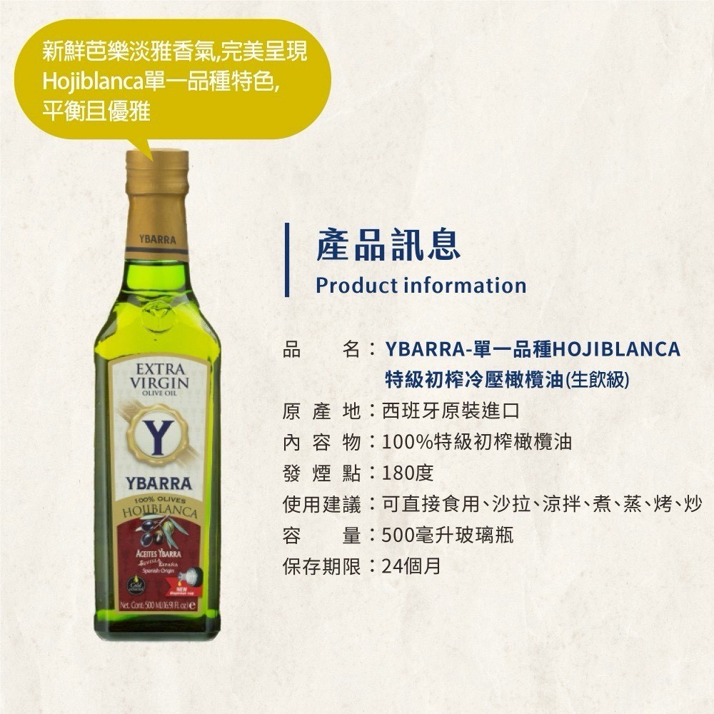 - 特選HOJIBLANCA單一品種的橄欖製成,油質純粹香氣迷人