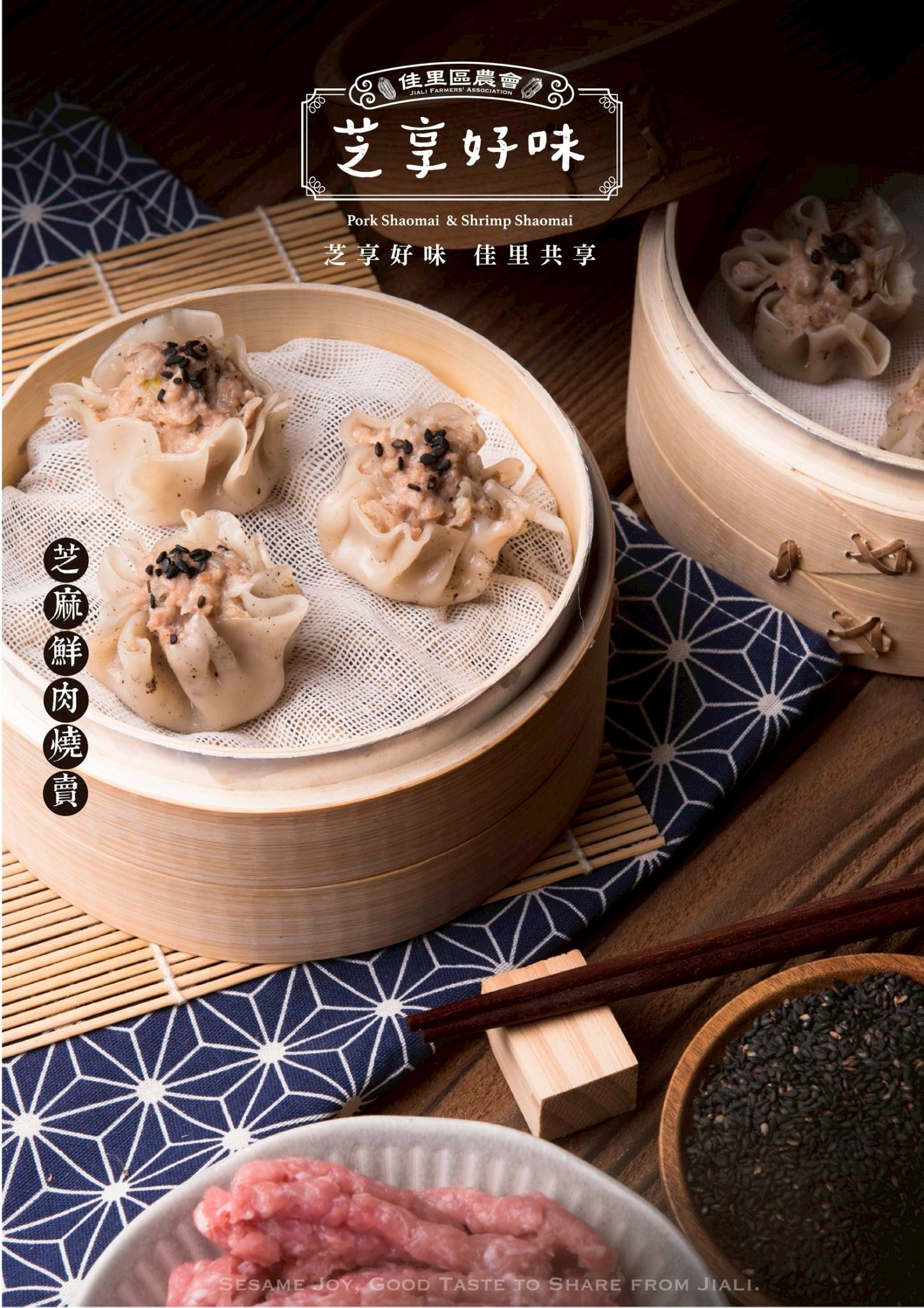 佳里農會推出新品芝麻燒賣,分別有豬肉、鮮蝦兩款口味,燒賣外皮添加芝麻粉,並在燒賣上面撒有黑芝麻顆粒,彰顯胡麻香。