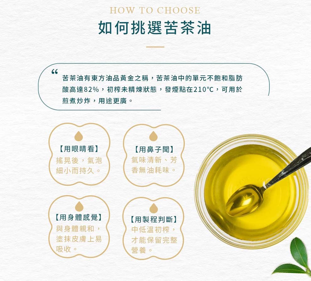 來自高品質苦茶籽的第一道低溫初榨,保留自然純粹的營養,富含 單元不飽和脂肪酸(Oleic Acid)及天然維生素E,每一滴都蘊含著土地的溫度與職人的用心。