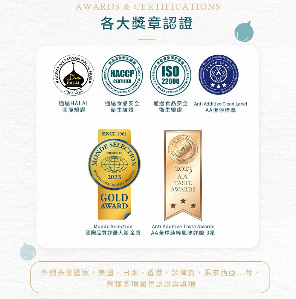 榮獲多項國際認證與大獎,包括 Monde Selection 國際品質評鑑金獎、ISO 認證、HACCP 食品安全管理 等肯定,品質經得起檢驗,也深受媒體與名人推薦。