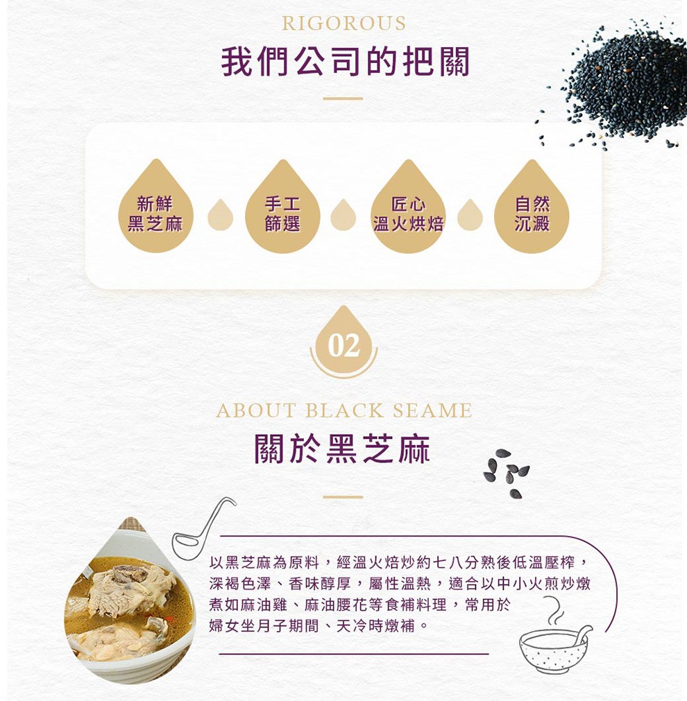 嚴選高品質黑芝麻籽,經人工篩選、低溫烘焙與自然熟成,保留最純粹的營養與濃郁芝麻香氣。