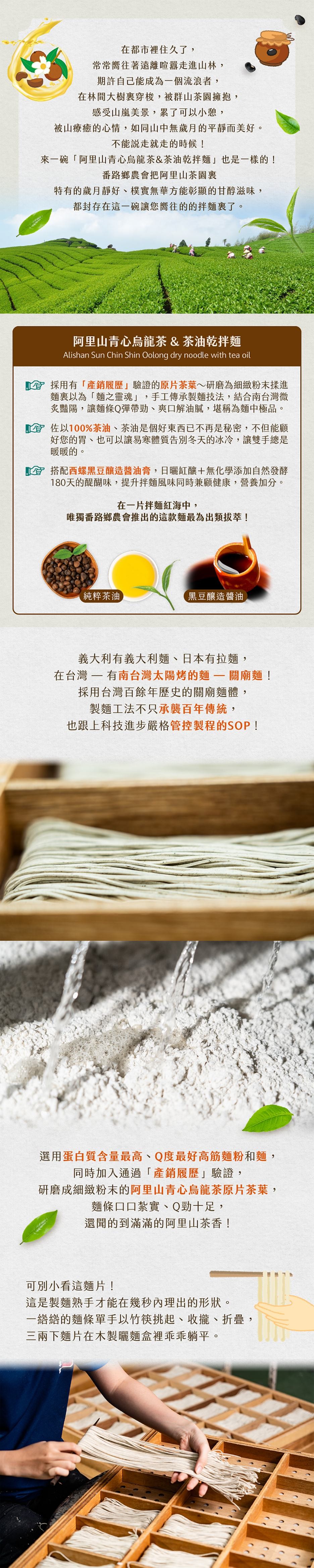 採用原片茶葉~研磨為細緻粉末揉進麵裏以為「麵之靈魂」,手工傳承製麵技法,結合南台灣微炙豔陽,讓麵條q彈帶勁、爽口解油膩,堪稱為麵中極品